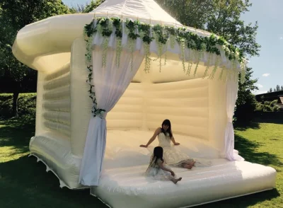 "Springt zur Hochzeit in den Hüpfspaß! Unsere Hochzeits-Hüpfburg (5.00 x 4.00 x 4.00 m) bietet Platz für 8 kleine Festgä...