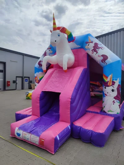 Hüpfburg „Mega Einhorn mit Rutsche innen und Dach“