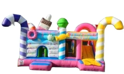 Tauche ein in die süße Welt der Erlebnis Candyworld! Diese farbenfrohe Hüpfburg in XXL (5.50 x 6.50 x 5.00 m) bietet Pla...