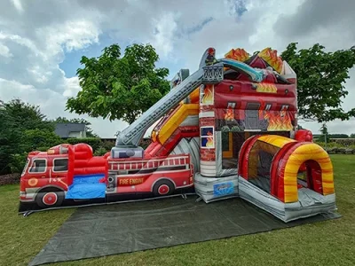 "Lass deine Kinder zu tapferen Feuerwehrleuten werden mit unserer XXL Hüpfburg, ausgestattet mit einer rasanten Rutsche!...